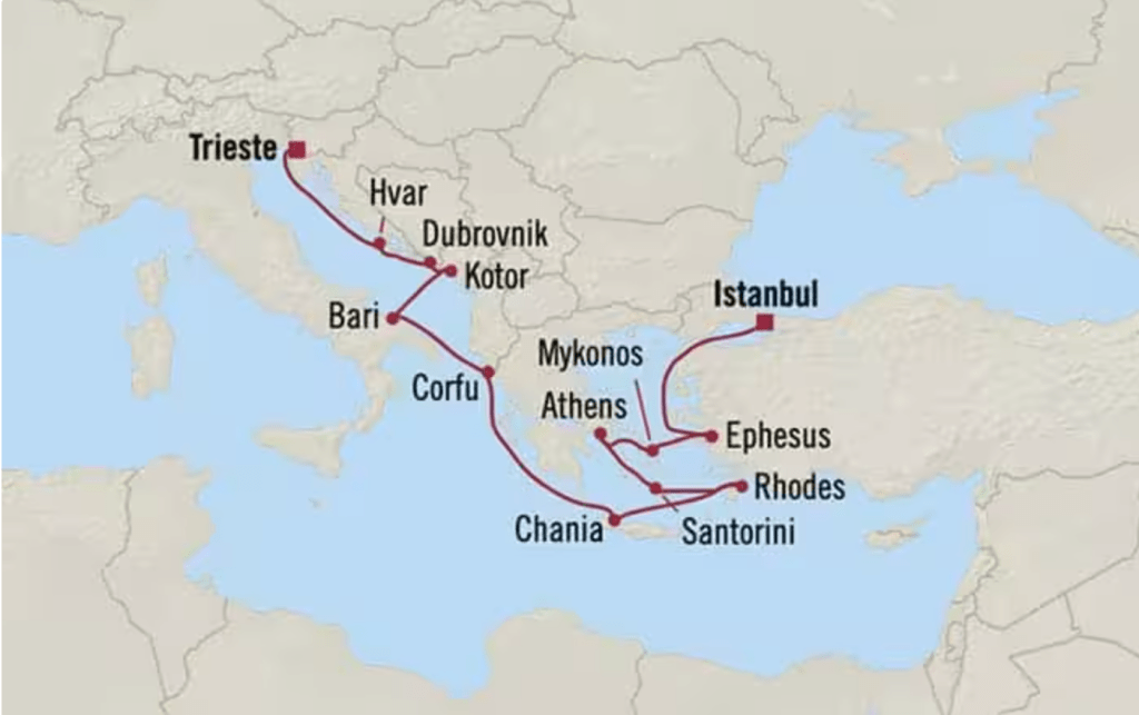 Set sail on a refined 14-night “Adriatic & Aegean Gems” voyage aboard NEW Oceania Allura, departing from Trieste (for Venice) and concluding in the storied city of Istanbul. This Mediterranean journey weaves through historic coastal towns, ancient ruins, and sun-drenched islands — from Croatia’s red-roofed charm to Greek isles like Rhodes and Santorini, and finally into Turkey’s cultural heart. With Oceania’s small-ship luxury, gourmet dining, and immersive shore excursions, this cruise delivers both relaxation and deep cultural discovery.