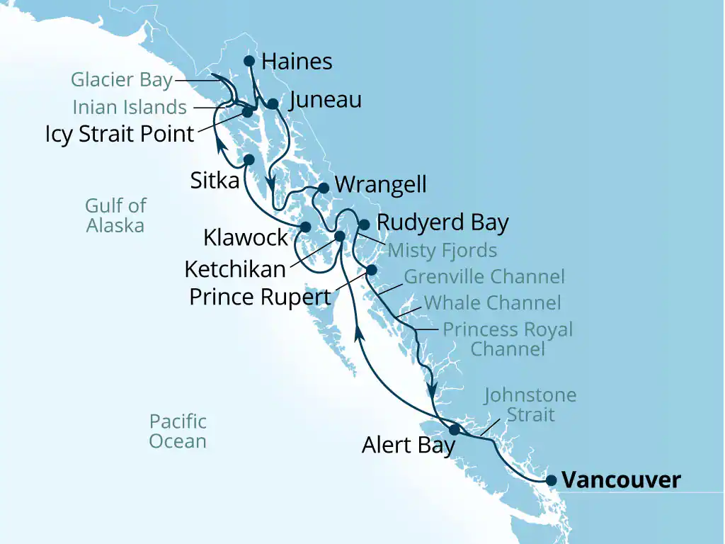 This majestic cruise explores the iconic Alaska Fjords, Canadian Inside Passage and Glacier Bay, sailing through scenic waterways, fjords and islands. Along the way you’ll call into charming coastal ports including Ketchikan, Klawock, Sitka, Icy Strait Point, Haines and Juneau, enjoy extended scenic cruising in Glacier Bay National Park and the serene Inian Islands, and discover the wilderness of Wrangell, Rudyerd Bay (Misty Fjords) and Prince Rupert. The adventure also features cultural visits to Alert Bay before returning to Vancouver, immersing you in the breathtaking wilderness, wildlife and natural beauty of Alaska and British Columbia..
