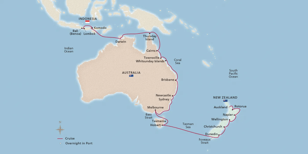 Sail from Aotearoa to the Indonesian archipelago on a voyage through diverse cultures. Admire stirring Māori dances and discover Hobart and Sydney’s penal past. See Napier’s art deco glories, Wellington and Christchurch’s scented English gardens, and Dunedin’s Victorian treasures. Immerse in Brisbane’s cosmopolitan flair and the relaxed charms of Darwin. Explore Komodo National Park and Lombok’s artisan villages on this unforgettable journey.
