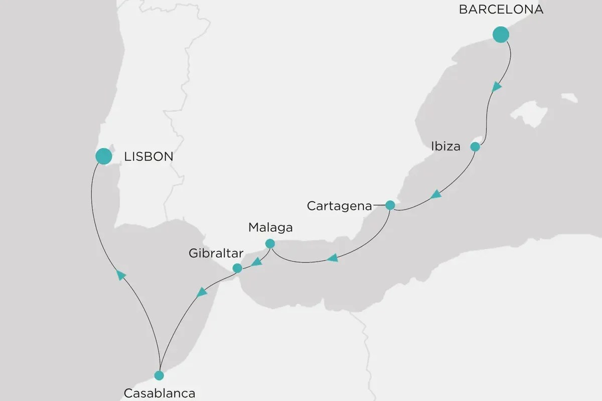 Be dazzled by some of Spain, Morocco, and Portugal’s gems on this cruise. Begin with an overnight in Barcelona before enjoying some late summer sun in Ibiza long after the crowds have gone. Spain’s Cartagena is next, followed by Malaga’s eclectic mix of history. The next call is Gibraltar, a tiny, unexpected piece of the UK in the Mediterranean. Overnight in Casablanca, and enjoy soaking up the atmosphere in the labyrinthine souk. End your journey with an overnight in Lisbon’s colorful charm.
