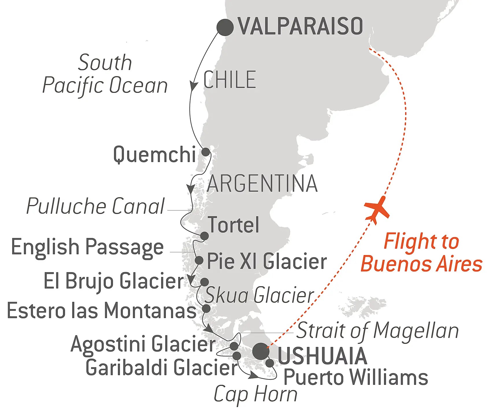 You will enjoy an unforgettable experience of sailing along the Strait of Magellan, then you will glimpse the gigantic Agostini and Garibaldi before rounding Cape Horn, surrounded by the stunning scenery provided by Tierra del Fuego National Park.