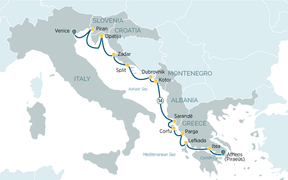 Navigating from the seaside idyll of Athens to the iconic ‘City of Canals’, this 15-day voyage tours the Mediterranean. After passing through the Corinth Canal, see the archaeological site of Delphi and the inaugural stone temples of Athena and Apollo. Sample local mussels fresh from the sea in Sarandë or stroll the perimeter of Kotor’s ancient city walls. Along the Adriatic coastline, sip some of the very best Croatian wines in Korcula, and mingle with the glam set in Hvar.