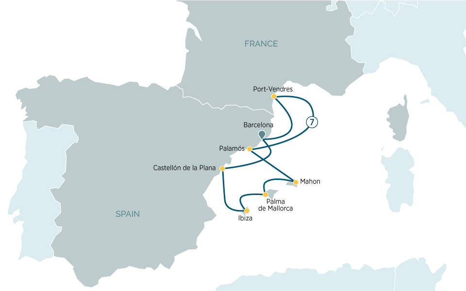 Welcome aboard this 8-day cruise of the Balearic Islands, an awe-inspiring archipelago of islands and islets east of the Spanish mainland. We set sail from Barcelona and navigate to coastal havens such as Palamós, Mahón, Palma de Mallorca and Ibiza. Get ready to admire the carmine-coloured cliffs rising out of blue waters off the Vermilion Coast. Savour a bold-flavoured local cheese in Mahón, or freshly caught prawns in Palamós. In Ibiza, soak up the vibrant party-luxe lifestyle and the raw beauty of this famous island. This seafaring adventure concludes in Barcelona, Spain.