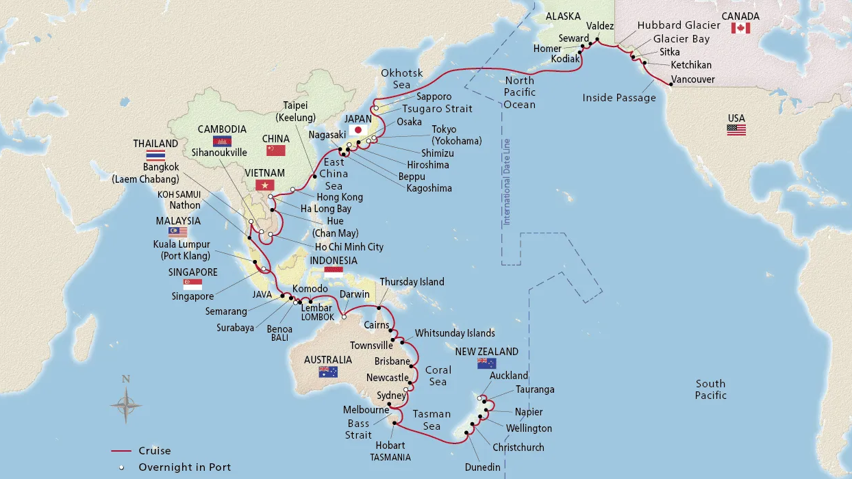 This 93-day cruise combines Australia & New Zealand; Komodo & the Australian Coast; Bangkok, Bali & Beyond; Southeast Asia & Hong Kong; Far Eastern Horizons and North Pacific Passage. Bridge oceans and continents on our most epic Pacific itinerary yet. Overnight stays in 14 ports help you immerse yourself in a fascinating array of cultures and let you embrace endless opportunities to get to know locals. It is an enriching journey unlike any other.