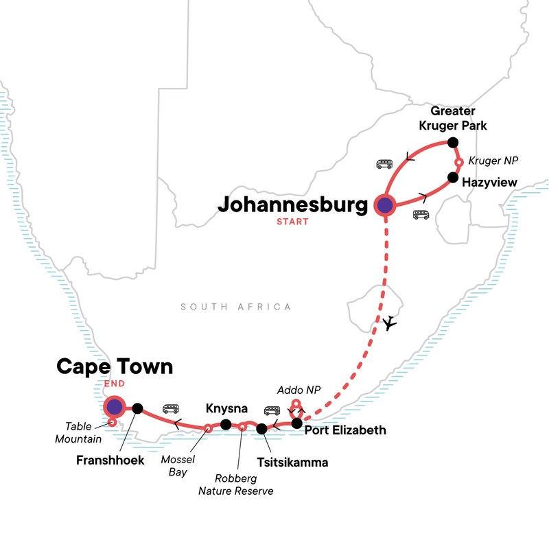 From Johannesburg to Cape Town — and all the incredible stops in between — this 18-day adventure kicks off with high-energy Big Five spotting and wraps up with chilled-out vibes in sunny Cape Town. Explore Greater Kruger and Kruger National Park on thrilling safari drives, a bush walk, and a classic South African braai. Then, hit the Garden Route with your CEO and travel crew to discover the beauty of this iconic coastal journey. Stay active with light treks through national parks, or ramp it up by cycling through the vineyards of Franschhoek. Prefer to relax? A wine tasting is the perfect way to toast the adventure of a lifetime. However you spend your days, you’ll head home with unforgettable memories.