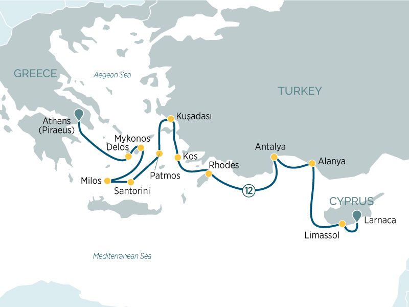 The Histories of the Mediterranean voyage sets off from Athens on a 13-day journey through the Greek islands, the coastal cities of Turkey and Cyprus. Discover the mythological allure of Delos and Mykonos. See the kaleidoscope of soil hues on Milos, the ‘Island of Colours’, and the homeland of the famed Venus of Milo statue. Snap a memorable photograph of Santorini, and visit Patmos, Rhodes, Antalya, and more. Your luxurious Emerald Cruises journey concludes in stunning Cyprus.