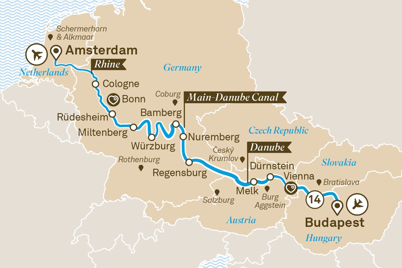 Restored castles still stand watch from their position atop dramatic hilltops, just as they did in the days of feudal knights and land barons. However, today the sites of ancient battles and medieval skirmishes have been replaced by a tranquil countryside with thriving towns and villages. Elsewhere, romantic ruins echo with a timeless beauty and Gothic spires rise out of the picturesque communities nestled along the riverbanks. This is a journey that will take you through the Europe of your imagination, full of wonder, recalling medieval jousts, cobbled streets and childhood fairy tales while creating memories that will last a lifetime.