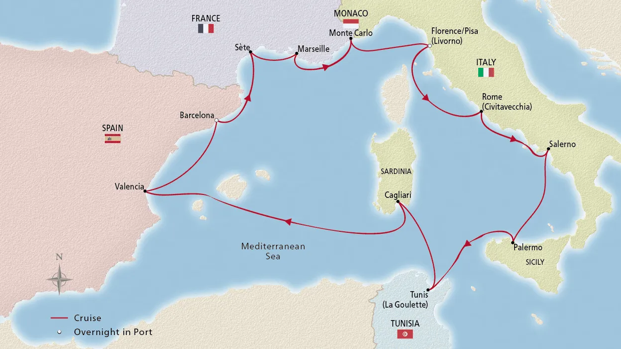 Explore the famed landmarks of Italy, Tunisia, Spain and France as you embark on a voyage through the Mediterranean Sea. See Palermo’s UNESCO World Heritage Sites in Sicily, trace the stunning Amalfi Coast and immerse yourself in Sardinian culture. Sail to Tunisia’s vibrant La Goulette, call at historic Valencia, visit glamorous Monte Carlo and stroll the streets of colorful Sète. Overnights in Barcelona and Florence allow you to explore more.