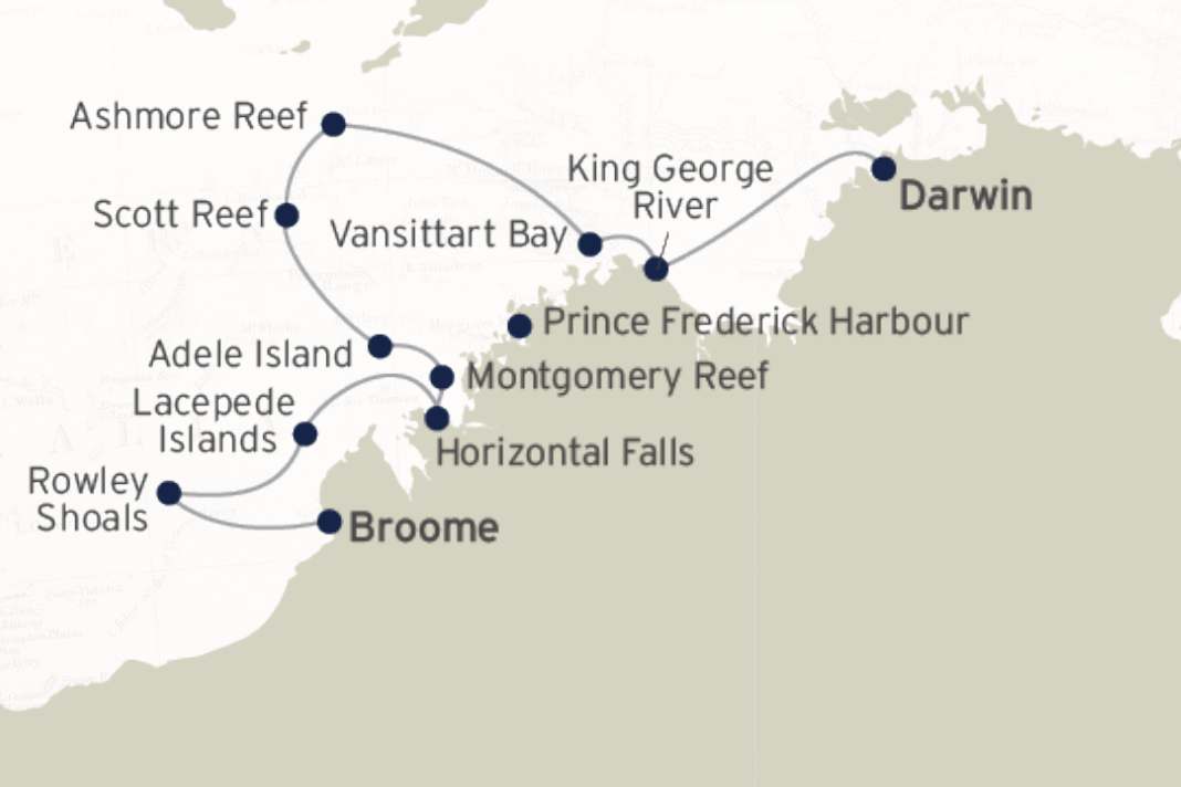 This itinerary combines our classic 10-day Kimberley itinerary with a visit to the spectacular Rowley Shoals Marine Park and Ashmore Reef. Witness magnificent coastal vistas created by towering rock ridges, silent secluded gorges, abundant wildlife, and massive tidal movements. Expert guides interpret 40,000-year-old rock art, and retrace the history of Phillip Parker King who first charted this spectacular coastline 200 years ago. Board a Zodiac and touch the spray from the magnificent King George River and its towering 80-metre sandstone escarpments. Join an expert guide to learn about the history of the ancient Wandjina and Gwion Gwion rock paintings. Witness waterfalls cascading off Montgomery Reef as it rises out of the ocean on the ebbing tide, whilst discovering the reef’s diverse marine life. Finish off the voyage at a chain of coral atolls offering some of the best snorkelling and diving opportunities in the world. Their shallow lagoons are inhabited by myriad coral species and marine life, including giant potato cod, Maori wrasse, at least 233 species of coral and 688 species of fish – many of which are not found on other coral reefs.