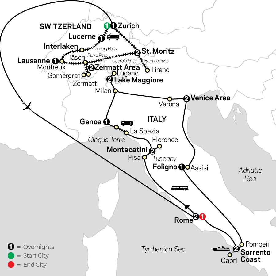Journey through the breathtaking landscapes of Switzerland and Italy, from the snow-capped Alps to sun-soaked coastlines. Ride the iconic Glacier Express, Bernina Express and Golden Pass Panoramic trains, taking in Switzerland’s mountain vistas, lakes and charming towns before exploring Italy’s Cinque Terre, Tuscany, and Lake Maggiore. Conclude your adventure with guided tours of Rome, Florence, Assisi, Genoa and Venice, discovering ancient ruins, world-class art and timeless beauty along the way.