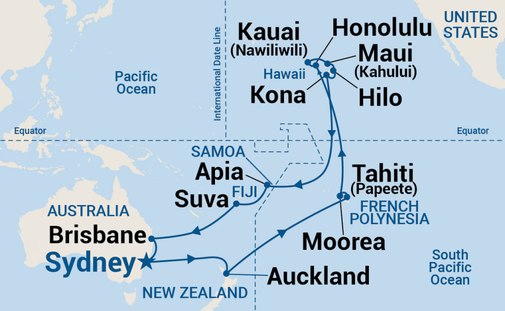 Departing Sydney, this epic Pacific voyage sails to New Zealand, French Polynesia, Hawaii, Samoa and Fiji before returning to Australia. The journey begins with a stop in Auckland, then crosses the International Date Line to the islands of Tahiti and Moorea. From there, the cruise continues across the Pacific to explore multiple Hawaiian Islands, including Hilo, Kona, Kauai, Honolulu and Maui. On the return voyage to Australia, the ship visits Apia in Samoa and Suva in Fiji, before arriving in Brisbane and Sydney. The itinerary combines stunning island destinations with relaxing sea days across the Pacific Ocean.
