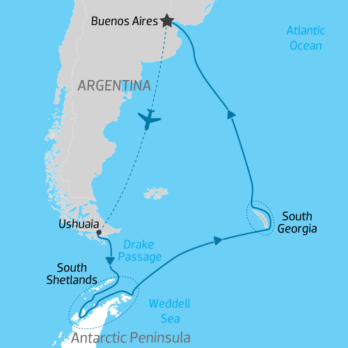 This incredible 19-day adventure takes you from Tierra del Fuego’s capital, Ushuaia across the Drake Passage to the Antarctic Peninsula, before sailing on to wildlife-rich South Georgia. Explore the remote yet ruggedly beautiful sub-Antarctic island of South Georgia, with its immense colonies of king penguins and rich history. Head to the heart of the White Continent as you sail to the Antarctic Peninsula, a stunning desert of ice where drifting icebergs, glaciers, snow-capped peaks and a fascinating array of wildlife is waiting. On South Georgia, see the relics of whaling activities and the grave of the famous British explorer, Sir Ernest Shackleton.
