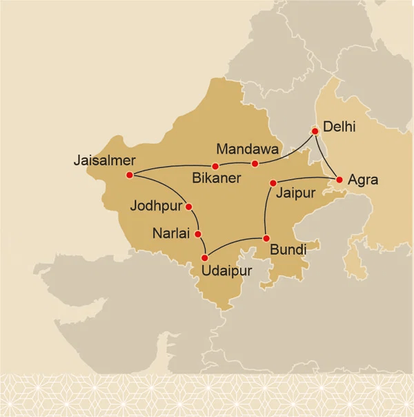 ⚲ Delhi – Mandawa – Bikaner – Jaisalmer – Jodhpur – Narlai – Udaipur – Bundi – Jaipur – Agra – Delhi