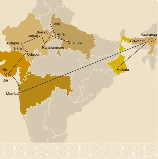 ⚲ Delhi – Agra – Chambal – Bharatpur – Ranthambore – Jaipur – Jodhpur – Bera – Udaipur – Gir – Mumbai – Kaziranga – Kolkata