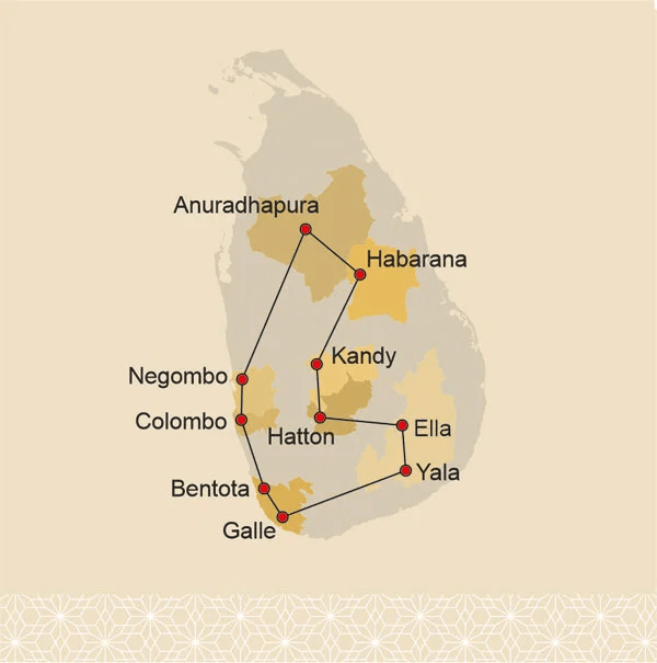 ⚲ Colombo – Negombo – Anuradhapura – Habarana – Kandy – Hatton – Ella – Yala – Galle – Bentota – Colombo