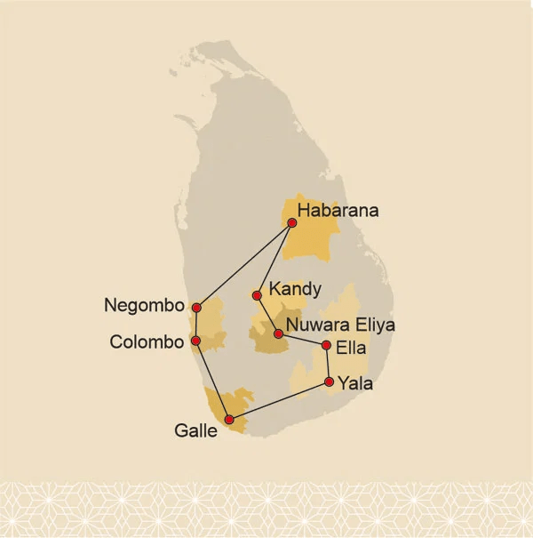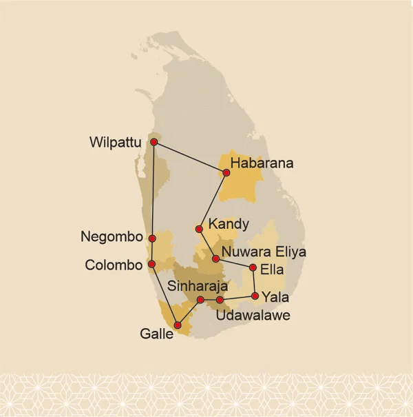 ⚲ Negombo – Wilpattu – Habarana – Kandy – Nuwara Eliya – Ella – Yala – Udawalawe – Sinharaja – Galle – Colombo
